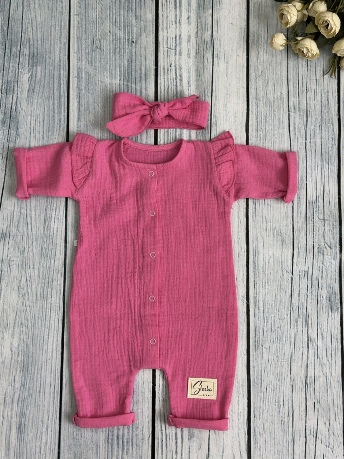 336-Ф. Комбинезон с повязкой для девочки из муслина, хлопок 100%, размеры 56,62,68, фуксия