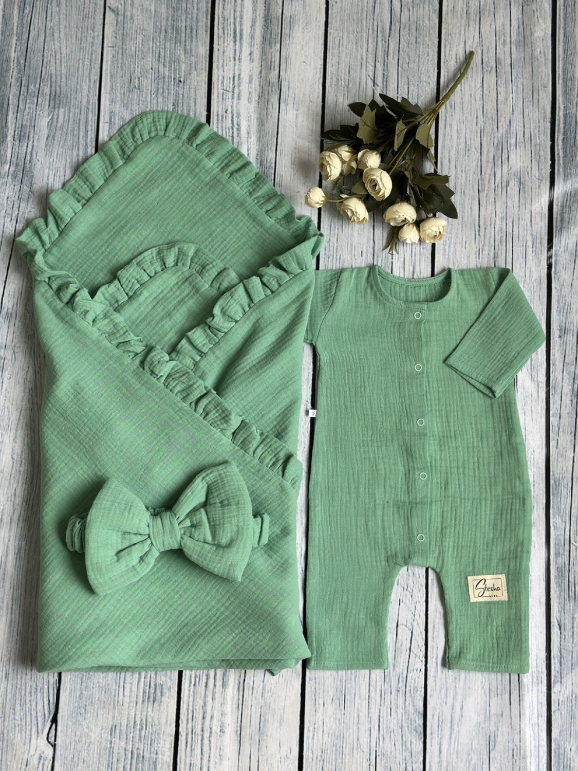 Теги: Купить детские конверты, комбинезон оптом, детские конверты на выписку оптом. 335-ОЛ. Комплект из детского комбинезона, р 56 и конверта муслин, хлопок 100% 90/90 см, олива цена,отзывы официальный сайт "Стеша Ангарск"